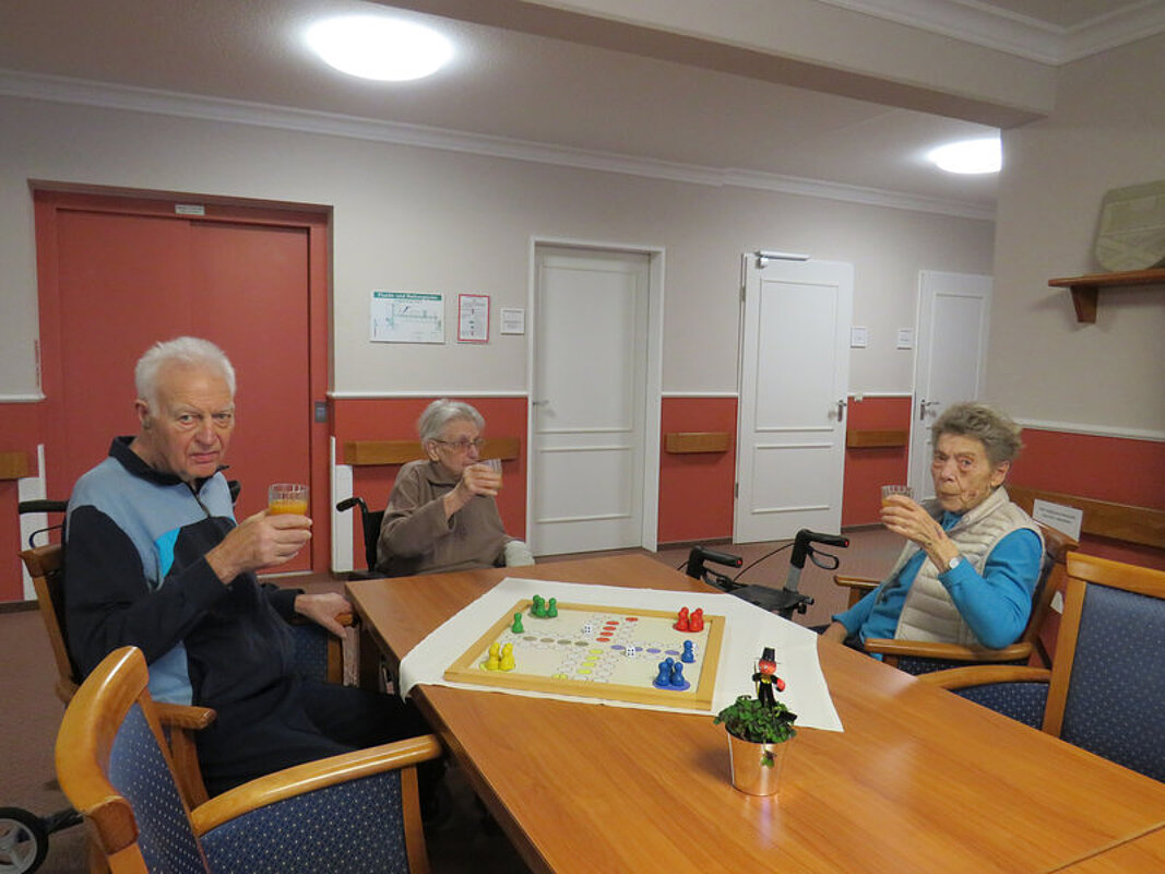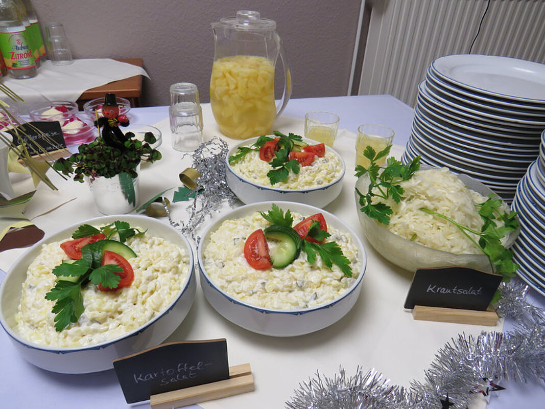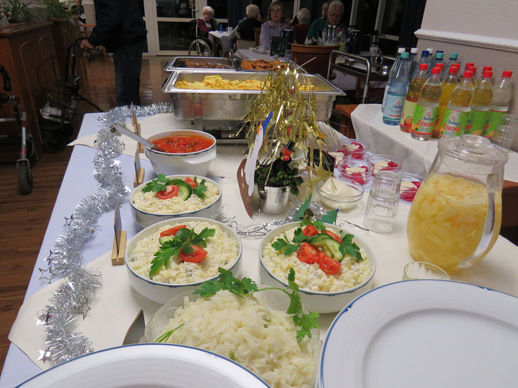 Unsere Bewohnerinnen und Bewohner freuten sich schon ganz besonders auf das Neujahrsbuffet. Es wurden Ananasbowle, Kartoffelsalat, Schnitzel, Frikadellen, Pommes Frites sowie einige Beilagen serviert. Zum Desser gab es Götterspeise mit Vanillesauce. "Vorzüglich" - lobten unsere Bewohnerinnen und Bewohner das Buffet.